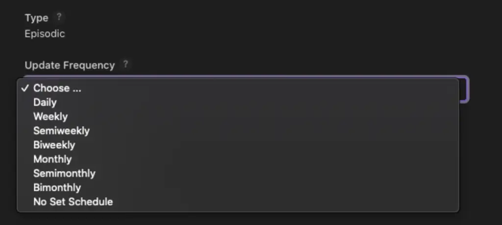 Apple lets you select how frequently you release new episodes in Apple Podcasts Connect. Their list of frequencies is a great place to get started when trying to decide how you should plan your show.