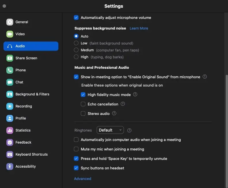 Further down the Audio tab, you will see an option to “Enable Original Sound” from the microphone. This is a setting you will want to test out. Some recordings need Zoom audio processing such as echo cancellation and background noise suppression. But if you are working with the Resonate Recordings team, it is better to have the original sound from your recording equipment and let us work our magic in post-processing.