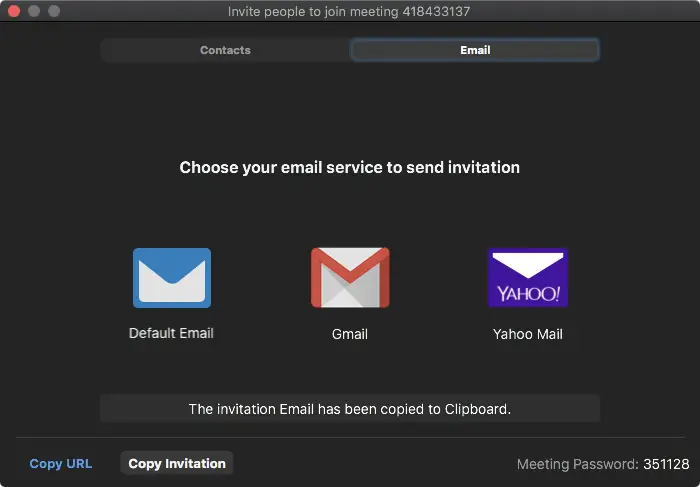 The first control you will need is the Invite button at the bottom. Tap “Invite” and then tap “Copy Invitation” to get the meeting ID and passcode. You can send this to your guest however you want — just paste it into an email or a message to them.