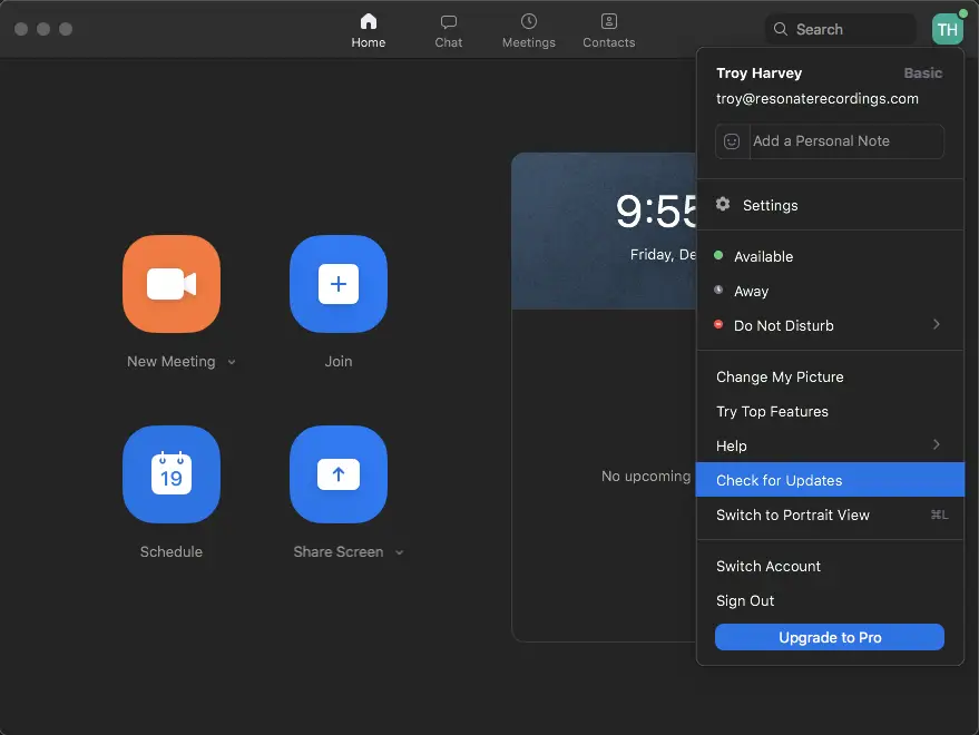 Before you start the call, be sure you are running the latest Zoom Meetings Client. Click your profile icon in the top right and then click “Check for Updates.” Ask all of your guests to do the same thing before you start the meeting. Zoom is constantly rolling out new updates, features, and bug fixes.