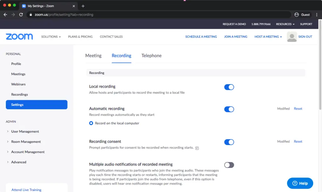 We recommend that you enable automatic recording and recording consent. This will ask your participants for their consent before recording the call. Be sure you understand the law before you disable the consent setting.