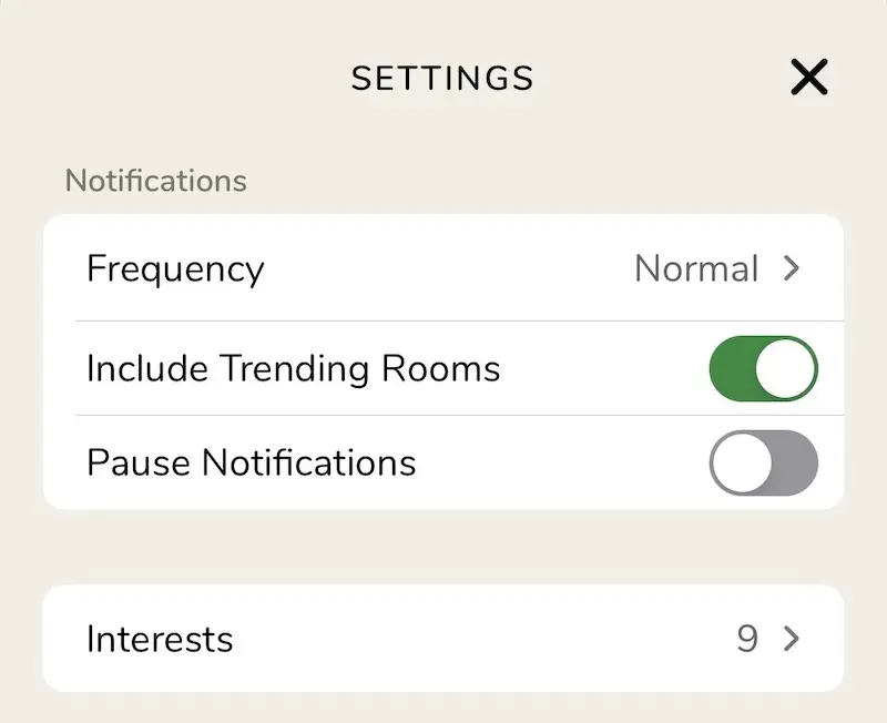 Notifications are intended to keep you from missing out on interesting new rooms, clubs, and scheduled events based around your interests. You can change the frequency of notifications, choose to be notified about Trending rooms, or pause notifications entirely under your Settings.