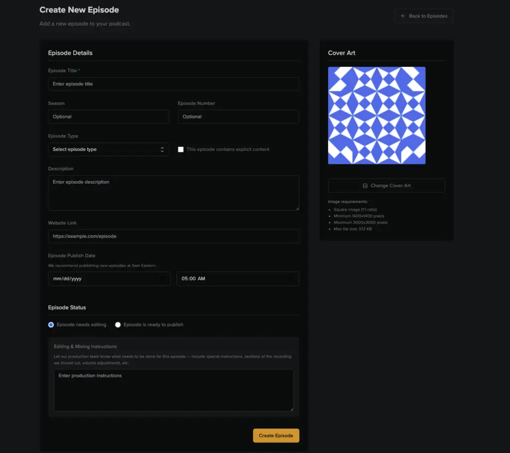 Return to the overview page and click ‘Create Episode’. Here, you can enter all of the episode information and add your episode cover art.