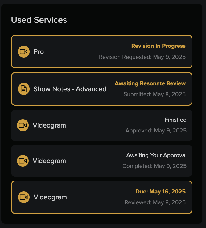 Both on the Overview page and episode pages, you will see icons for each episode indicating where it is in the process. Each icon is accompanied by a written description telling you when action is needed, or if you are waiting on Resonate.