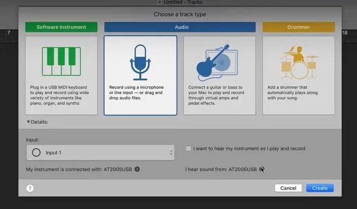 Pick “Audio” using a line input (this should be selected by default) and choose Input. After you press “Create” your new track will be added into your Garageband session.
