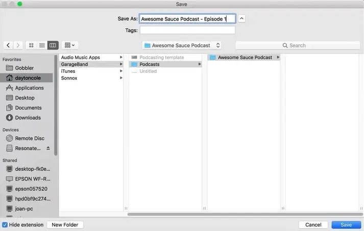 Once you open ‘Save As’ in GarageBand, you will see that the filed are stored within a default folder of your computer. We recommend that you create a subfolder for each podcast you work on, with subfolders for seasons and then individual sessions within those seasons.